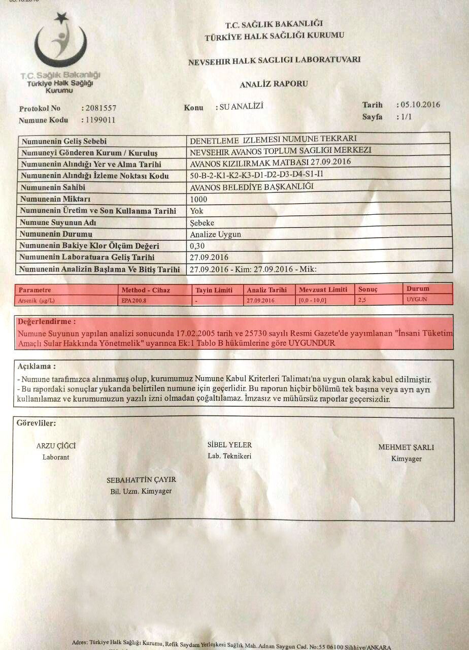 Belediyemiz Park ve Bahçeler Müdürlüğü bünyesinde faaliyet sürdüren, Avanos Belediyesi İçme Suyu Tesisi ve servis depolarından her ay alınan su numuneleri düzenli olarak analiz edilmektedir.Elde edilen analiz raporları Belediyemiz web sitesi üzerinden düzenli olarak vatandaşlarımızın bilgisine sunulmaktadır. Gerek Belediyemiz tarafından yapılan içme suyu analiz sonuçları gerekse Nevşehir Halk Sağlığı Müdürlüğü tarafından alınan numuneler üzerindeki su analiz sonuçları kamuoyunun bilgisine sunulmaktadır.Son içme suyu analiz raporuna göre; içme suyu değerlerimiz ve kalitemiz TSE, Dünya Sağlık Örgütü ve Avrupa Birliği standartlarına uygundur.Su analiz raporu yazımız altında yayınlanmaktadır.